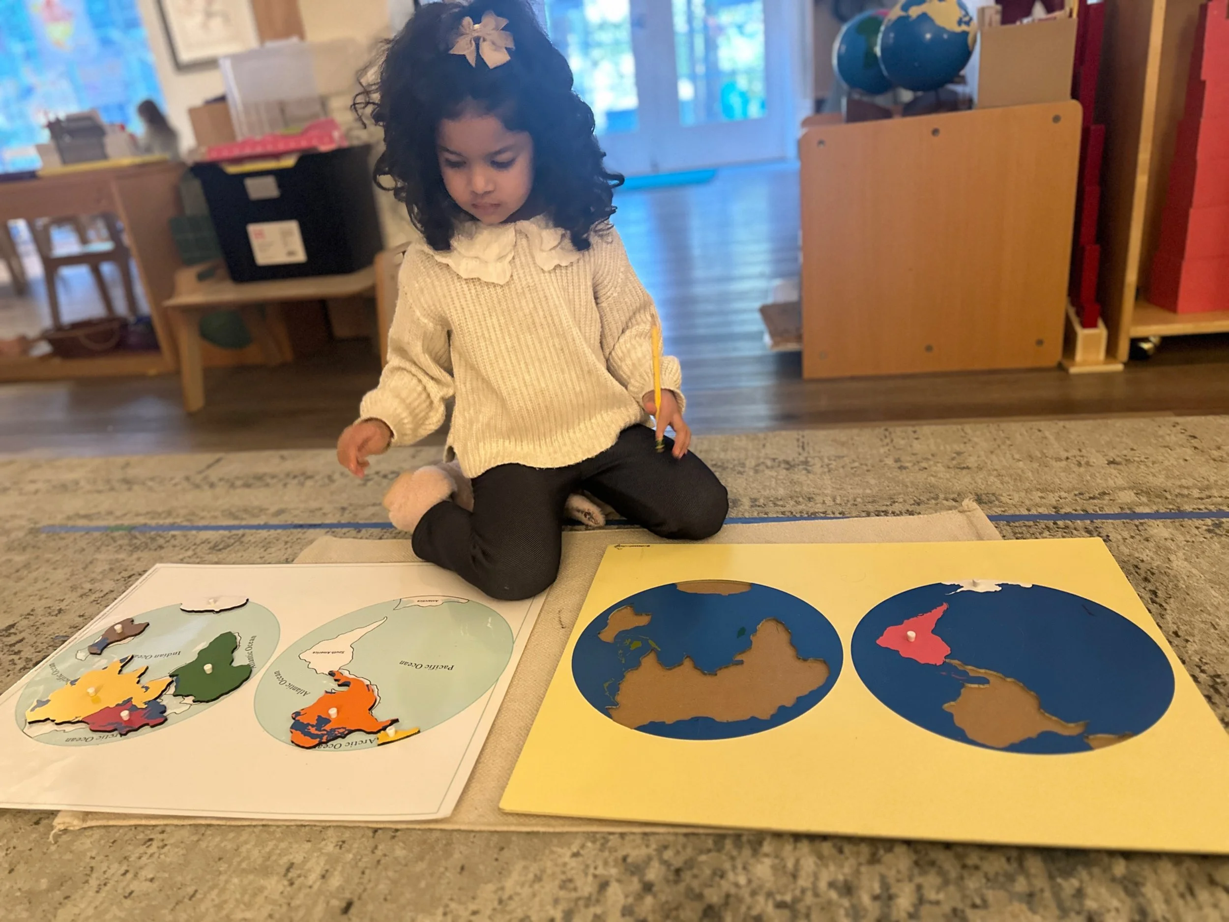 Our goal in Early Childhood classrooms is to inspire the child to feel the wonder and awe of the natural world, and to begin to understand this amazing world. The Montessori curriculum invites children to share many rich and varied experiences of geography, botany, zoology, cultural studies, history, physical science, and earth science. Children also enjoy experiences of botany and zoology in our outdoor learning environments.