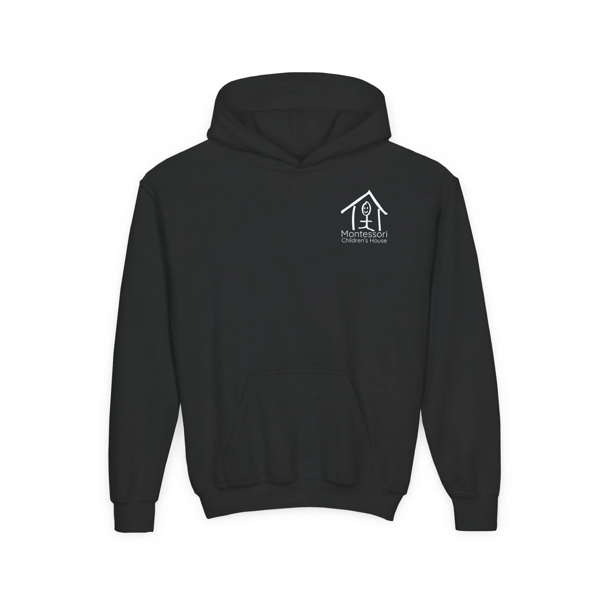 A cozy youth hoodie that carries a story — soft midweight fabric, roomy kangaroo pocket, and a comfortable hood for layering on cool mornings. The chest features a subtle embroidered cabin icon, while the back displays a vibrant circular scene: mountains, ocean, native motifs and a raised fist, encircled by the phrase “THE LAND IS WHERE OUR ROOTS ARE.” It feels like a wearable pledge — warm, durable, and ready for playground adventures, school trips, or family gatherings where identity and place matter. The regular fit and true-to-size construction make it easy for kids to move freely, while the mixed cotton-poly blend holds color and print detail through wash after wash.