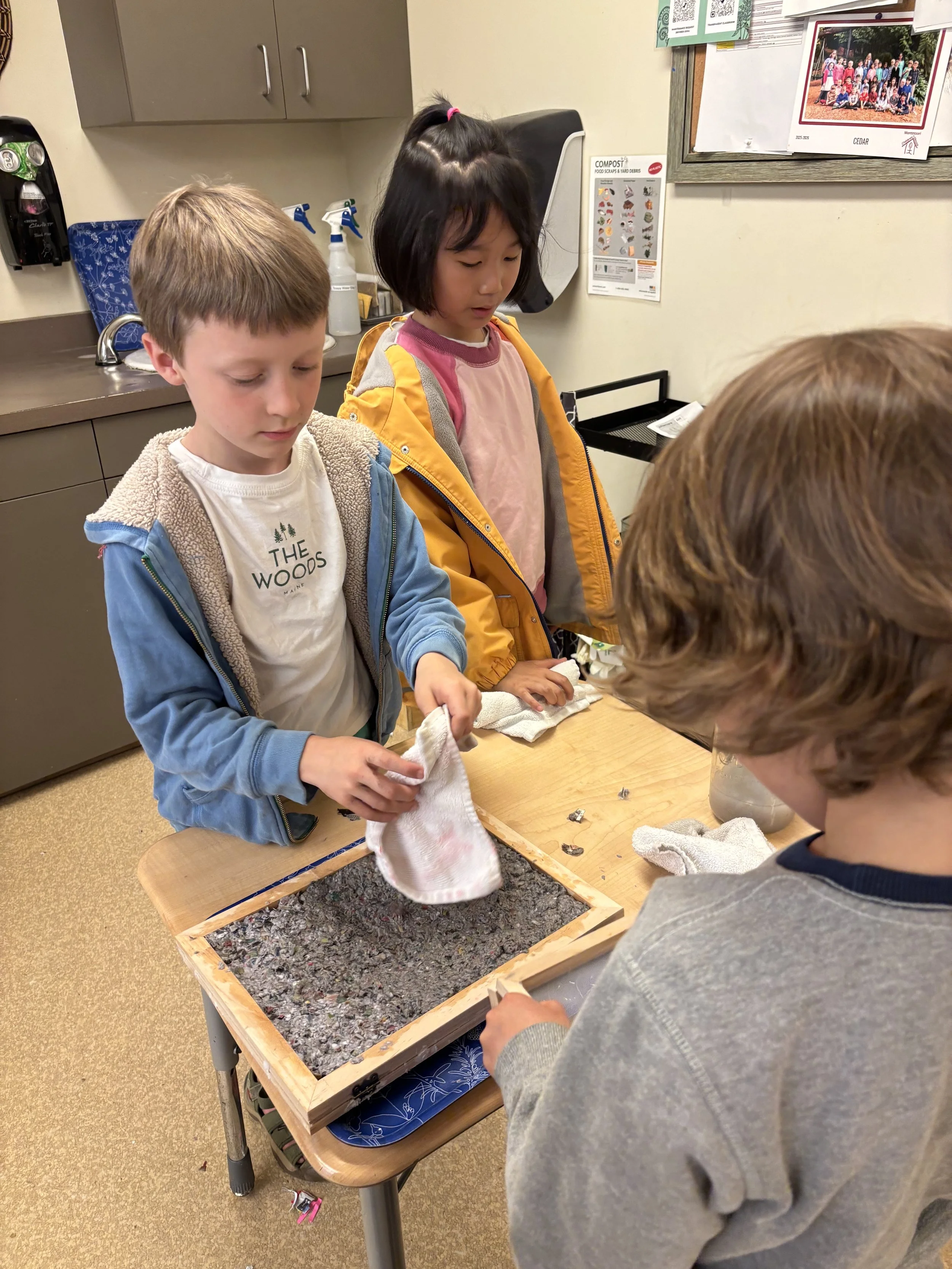 In the elementary programs, the work deepened in different directions. Lower Elementary students made seed paper from scraps and spent time nature journaling, while Upper Elementary students studied food webs in a hands-on way. They headed out to the trail to identify plants and look for evidence of consumers in the ecosystem, building toward their own understanding of how everything is connected. Even P.E. reflected the theme, with hikes, seasonal noticing, and games that brought the food web to life through movement.